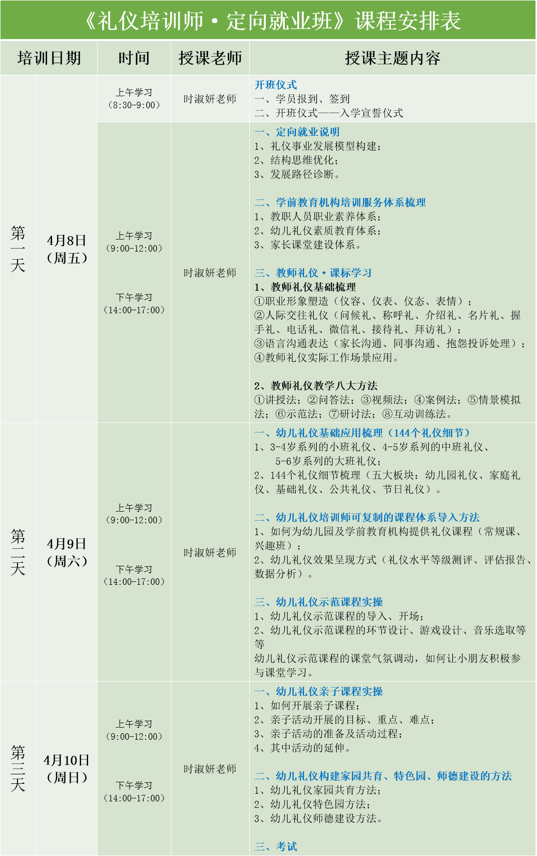 為加快高素質(zhì)禮儀培訓(xùn)師人才培養(yǎng)的步伐,增強(qiáng)禮儀培訓(xùn)師細(xì)分領(lǐng)域授課能力,全面提升禮儀培訓(xùn)師實(shí)際應(yīng)用解決問題能力,現(xiàn)面向以服務(wù)學(xué)前教育機(jī)構(gòu)(教職人員、幼兒、家長)的禮儀培訓(xùn)為職業(yè)發(fā)展方向人員,開展定向禮儀師資就業(yè)班。