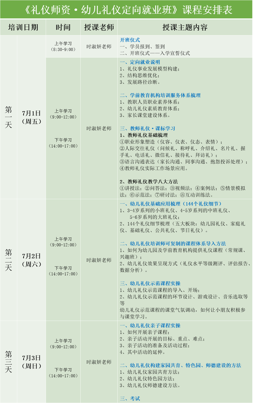 為了解決學(xué)前領(lǐng)域禮儀培訓(xùn)師資緊張的問題,幫助禮儀教育工作者掌握學(xué)前教育機(jī)構(gòu)(教職人員、幼兒、家長(zhǎng))禮儀訓(xùn)練內(nèi)容和教學(xué)規(guī)范、增強(qiáng)實(shí)際應(yīng)用授課能力、提高師資水平,建立學(xué)前教育領(lǐng)域禮儀培訓(xùn)專業(yè)教師隊(duì)伍,增強(qiáng)禮儀實(shí)際應(yīng)用及教學(xué)成果轉(zhuǎn)化,廣州市禮儀協(xié)會(huì)、廣州市德禮教育將于2022年7月1日—3日在廣州開展《禮儀師資·幼兒禮儀定向就業(yè)班》。詳情如下: