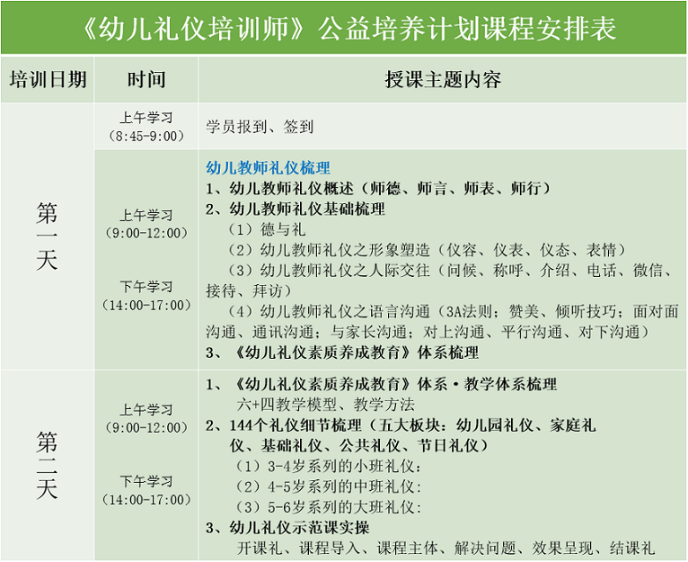 禮儀作為內(nèi)在的品德、品質(zhì)、修養(yǎng)的承載體和言行舉止、待人接物、與人交往溝通具體行為表達(dá),是成長至關(guān)重要的素質(zhì),也是好家風(fēng)家教的成果展現(xiàn),更是社會文明程度的體現(xiàn)。為了解決幼兒禮儀培訓(xùn)師資緊張的問題,幫助幼兒禮儀教育工作者掌握禮儀訓(xùn)練內(nèi)容和教學(xué)規(guī)范、增強(qiáng)實(shí)際應(yīng)用授課能力、提高師資水平,建立幼兒禮儀授課專業(yè)教師隊(duì)伍,增強(qiáng)禮儀實(shí)際應(yīng)用及教育成果轉(zhuǎn)化,廣州市禮儀協(xié)會、研禮教育、廣州市德禮教育將于2022年11月19日—20日在廣州開展《幼兒禮儀培訓(xùn)師》公益培養(yǎng)計(jì)劃。詳情如下: